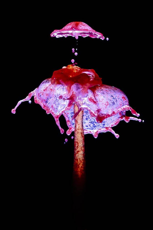 Like a sparkling umbrella, Crimson Umbrella unfolds midair. Shades of red and violet merge in a magical play of light and motion, where every droplet tells its own story. Its form resembles a delicate mushroom or a graceful parasol, suspended in time and space.