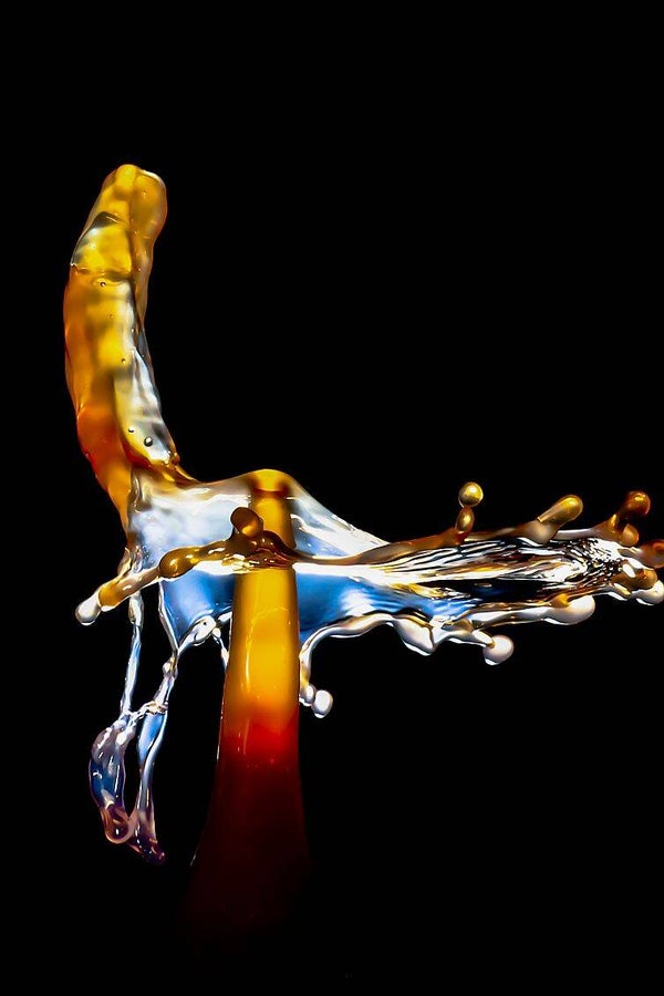 "Golden Horizon" toont een magisch moment waarin vloeistofdruppels zich ontvouwen tot een dans van licht en kleur. De warme gouden tinten vloeien samen met koel blauw, alsof de zon en de oceaan elkaar ontmoeten aan de rand van een nieuwe dag. Het spel van energie en beweging maakt dit kunstwerk een ware blikvanger die een ruimte vult met levendigheid en elegantie. Perfect als opvallend kunstwerk in een woonkamer, kantoor of moderne galerie.